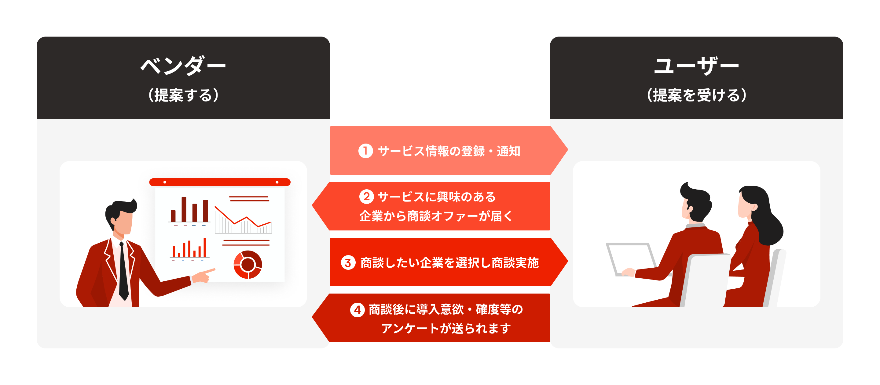 商談は相互提案の商談ではなく、ベンダーが提案しユーザーが提案を受ける一方向の商談となります