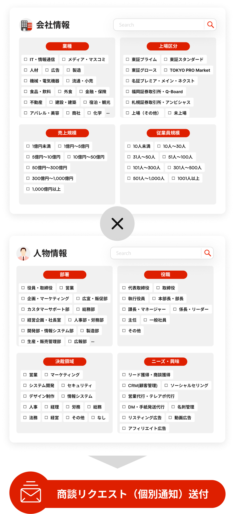 商談オファーが届く商談オファーで企業情報・部署役職・決裁領域に加え、貴社サービスに関する個別のBANT情報を確認できます