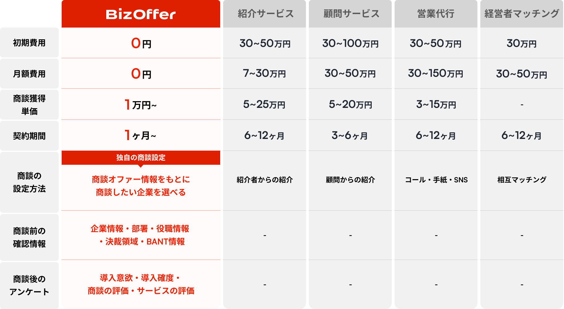 BizOfferは、初期費用0円・月額費用0円、完全成果報酬型で商談を獲得できるビジネスマッチングサービスです。
